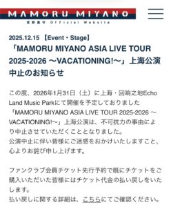 宮野真守原定於2026年1月31日(六)在上海・回响之地 Echo Land Music Park舉行的「MAMORU MIYANO ASIA LIVE TOUR 2025–2026 ~VACATIONING!~」上海公演,官方於本日宣佈因不可抗力因素,決定取消該場演出。