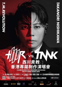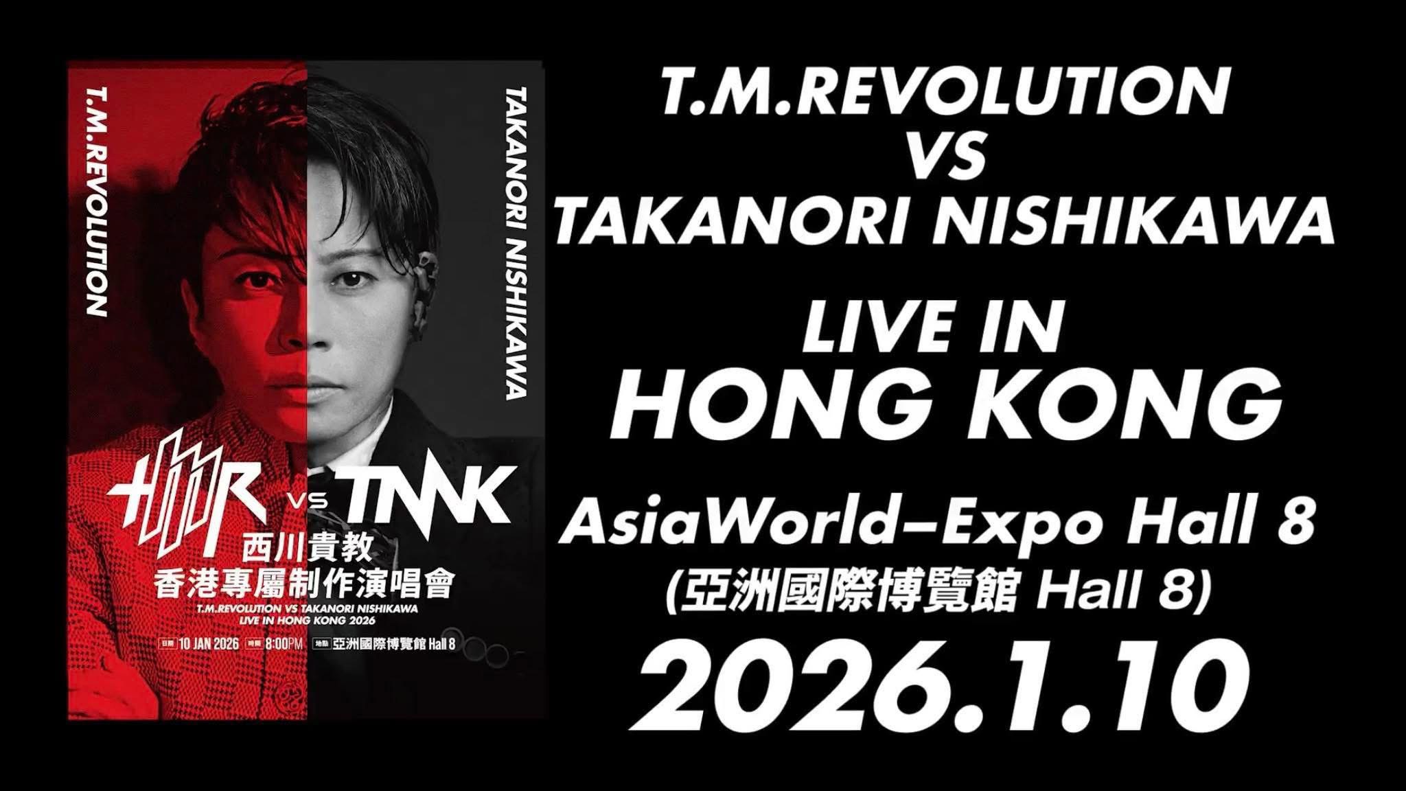 西川貴教今年4月受邀來港出演本地電視台ViuTV年度音樂頒獎禮「CHILL CLUB 推介榜 年度推介 24/25」並震撼全場,而早前其在社交平台上宣佈將於明年1月10日假香港亞洲博覽館HALL 8舉辦首個香港公演「T.M.Revolution VS 西川貴教 香港演唱會 2026」,門票定於10月16日早上11時起於Klook公開發售。