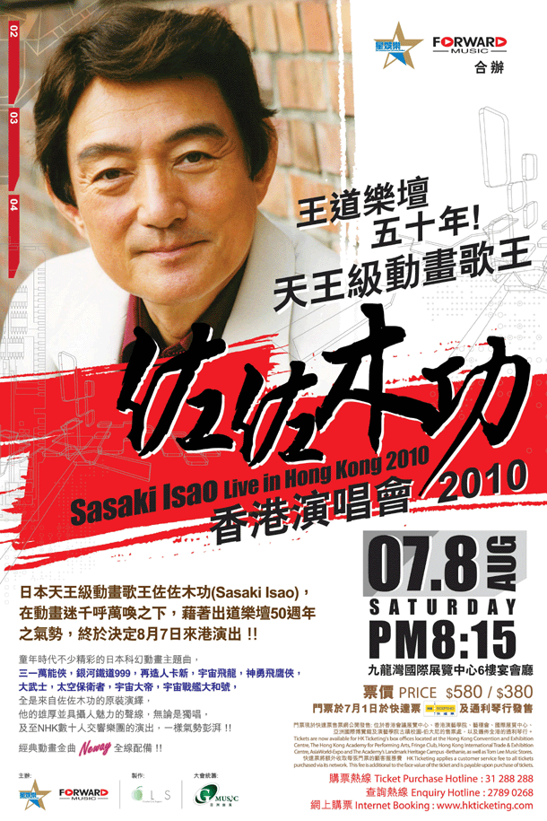 另外,有留意動漫歌曲的朋友也應該知道動畫歌曲大王 – 佐佐木功將會於八月來港舉辦他的出道五十週年演唱會! 為此,小編將於短期內開設一個佐佐木功的專輯,讓大家和小編一起了解這位令人能率動萬人人心,光芒四射的歌手!
