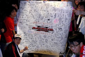 除了大旗與歌曲溫習,更有歌迷發起全場簽名運動,在一巨大海報上讓每一名到場的朋友都簽名並留下說話給JAM Project。如圖所見,到開場前大約晚上七時正的時候,海報上都已經滿滿的收集了不少歌迷的簽名,相信大家對JAM Project的熱情一定能夠傳達到他們那裡。